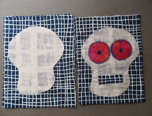 I have used it a lot, in the past couple of years, to make my skull designs really stand out. It is great for the background and for the mouth. I use a rustic sort of white fabric, as the skull, so the white is not glaring or clean looking. I made my own skull pattern, by attempting to draw a peanut shape. I keep all my patterns in a binder, so I can locate them when I want to use them again. If you draw a shape, then decide it is too small or too big, just resize it on your copy machine, or draw more lines inside or outside of the existing shape. I like the wonkiness of my skull pattern, as I can flip it one way or the other and have it a little different, instead of cookie cutter skulls. I fussy-cut the teeth and ghetto applique them onto the skull part. Of course, everyone knows that when doing applique on a Halloween project, you must use Stitch-Witchery to hold the pieces in place, while you sew. I don't like scary skeletons or skulls, so I like using large flower prints, or something similar, for the eyes. I have several good prints that work very well for this.